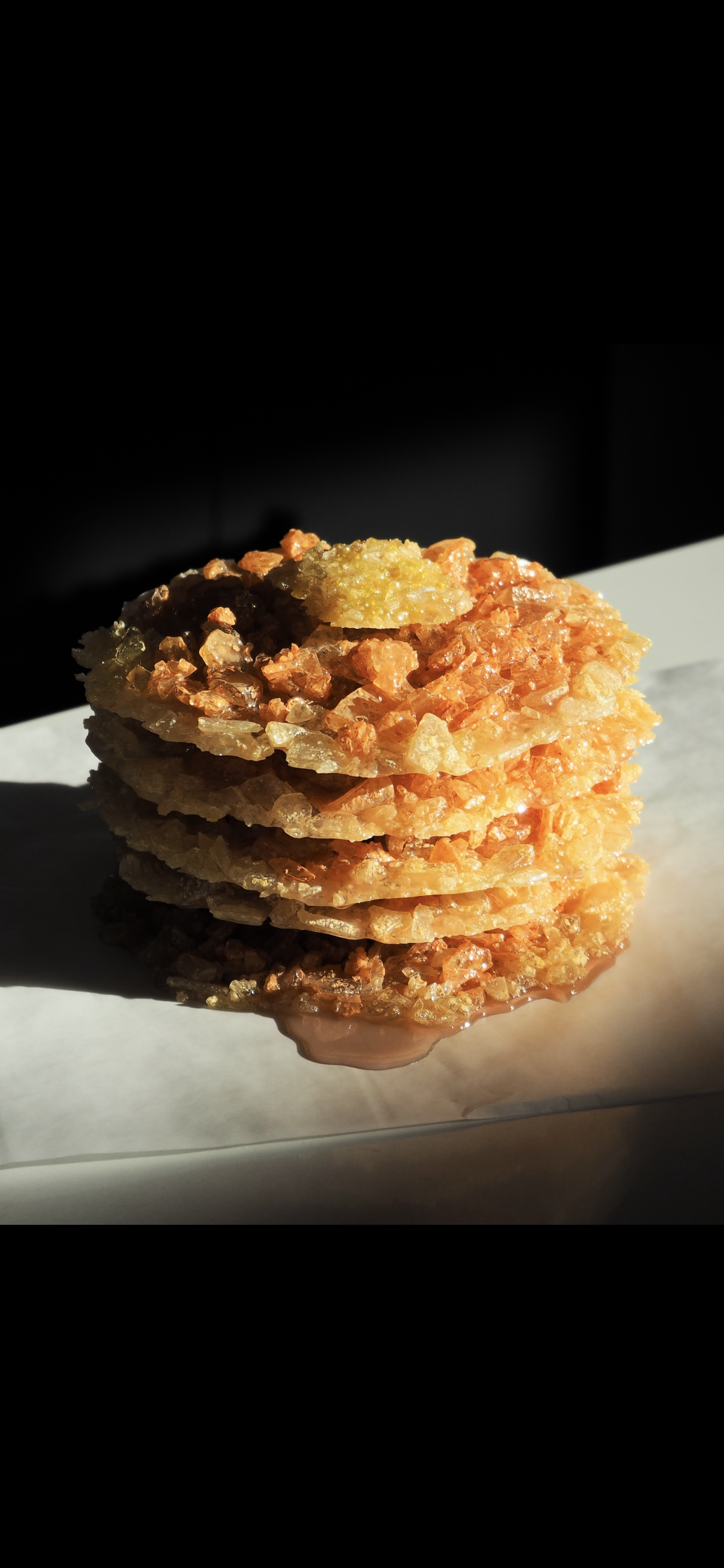 The sweetest serving of glass. Influenced by the rich and warm colours that pancakes produce. Developed with a trial run of resin dye to mimic maple syrup. Arguably the best way to start the day. The third Inedible artwork.